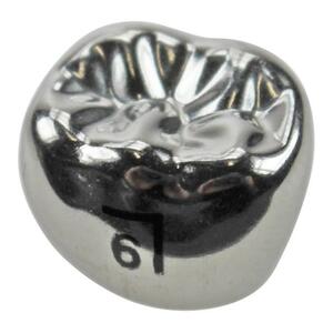 Teräskruunu molaareille. Valmistettu ruostumattomasta teräsksestä. Hyvä istuvuus ja pitkäaikainen ratkaisu. Koko 6-LR-6, ala oikea. Mesio-distaalinen halkaisija 12,4 mm.