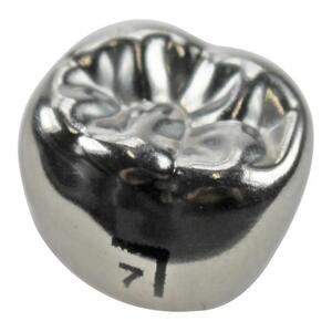 Teräskruunu molaareille. Valmistettu ruostumattomasta teräsksestä. Hyvä istuvuus ja pitkäaikainen ratkaisu. Koko 6-LR-7, ala oikea. Mesio-distaalinen halkaisija 12,8 mm.