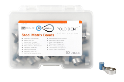 Ruostumattomasta teräksestä valmistettu, anatomisesti muotoiltu matriisi. Koko 5 mm x 0,03 mm.