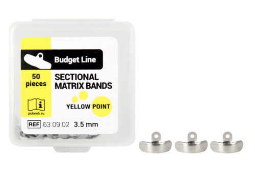 Muotoiltu ohut matriisi. Ruostumatonta terästä. Matriisin asettelua ja poistoa helpottaa kieleke matriisin yläosassa. Koko 3,5 mm.
